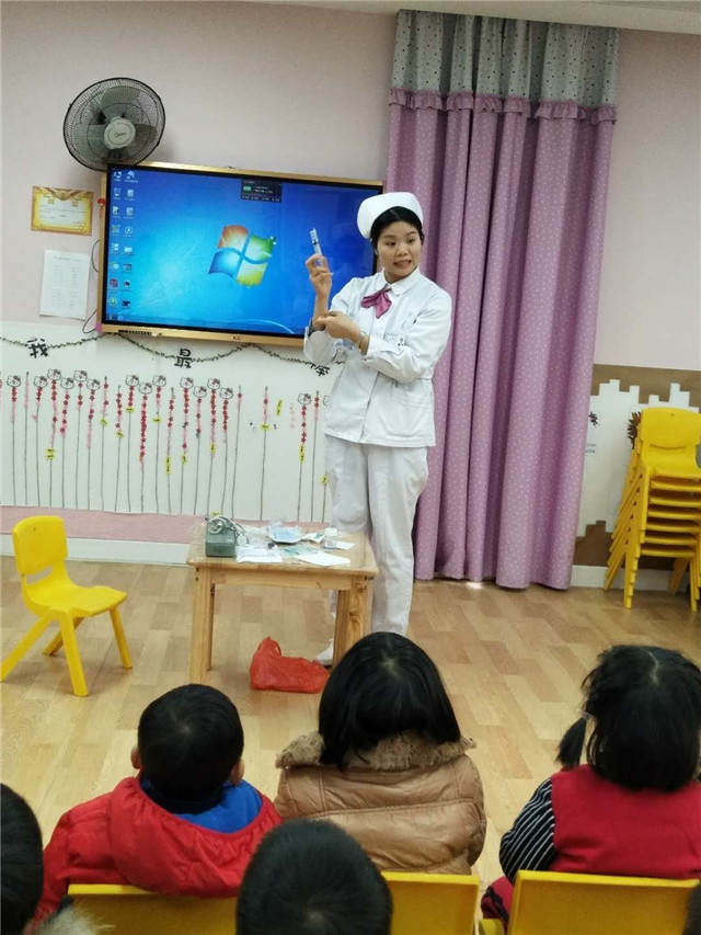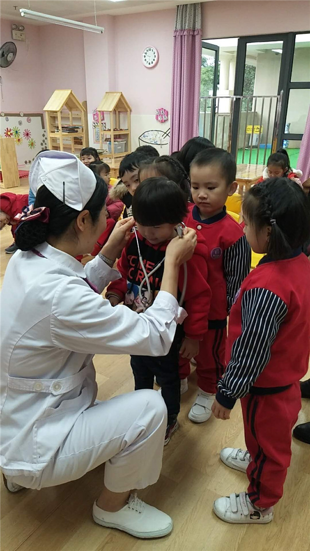 护士老师给小朋友们介绍的相关医学小知识,为了让小朋友们体验不一样的上课形式,护士老师还设置了医院场景,让小朋友们来扮演小医生、小护士,学着用听诊器来听小朋友的心跳。活动中小朋友们都表现得很好,认真听讲、踊跃发言,在边玩边学的过程中积累了丰富的医学知识。