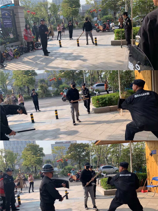 与此同时,幼儿园警戒保卫组成员紧急行动,手持棍棒、钢叉等器械,将“歹徒”围住,临危不乱地与“歹徒”交涉、周旋,牵制“歹徒”,不让“歹徒”接近幼儿,竭力保护全园师生安全。