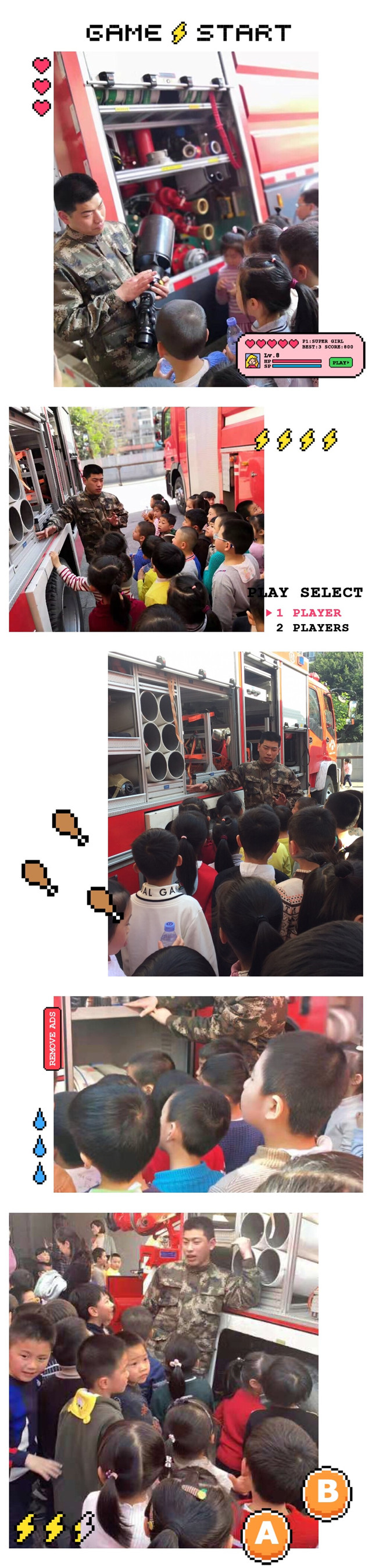 首先,消防员叔叔向小朋友们一一介绍了各种功能不同的消防车辆和消防救生器材。当各种各样的消防器材设备呈现在小朋友的面前时,小朋友们表现出极大的兴趣,好奇地问消防员叔叔:“这个是干什么用的?那个是干什么用的?”消防员叔叔耐心地一一讲解。
