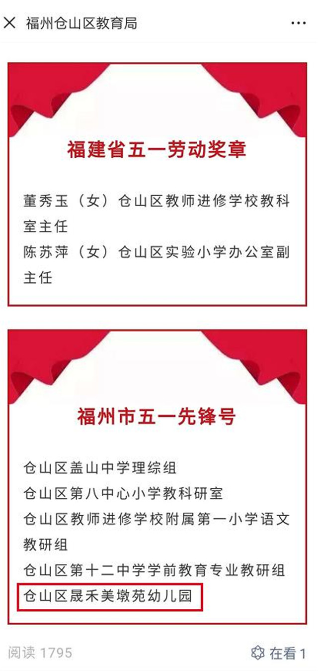 4月29日上午,福州市总工会“五一节”表彰大会在市工人文化宫举行。大会上,福州市教育系统77个集体获市总工会、市委市政府表彰,其中,仓山区晟禾美墩苑幼儿园荣获福州市“五一先锋号”荣誉称号。