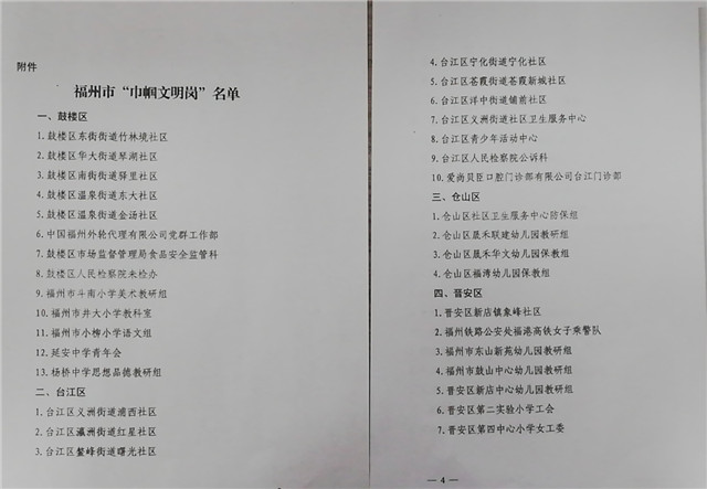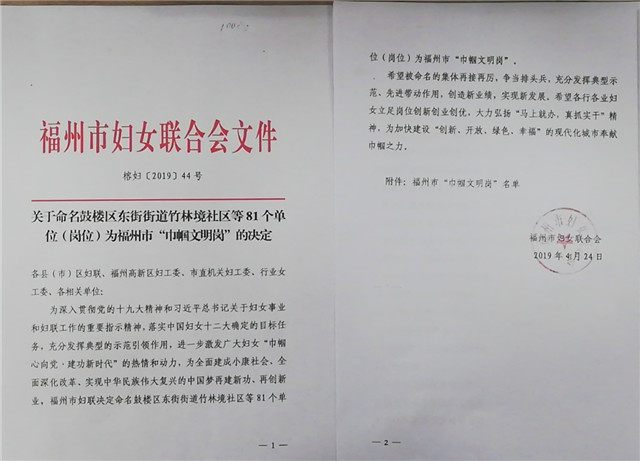 近日,福州市妇女联合会发布了《关于命名鼓楼区东街街道竹林境社区等81个单位(岗位)为福州市“巾帼文明岗”的决定》(榕妇【2019】44号)文件。