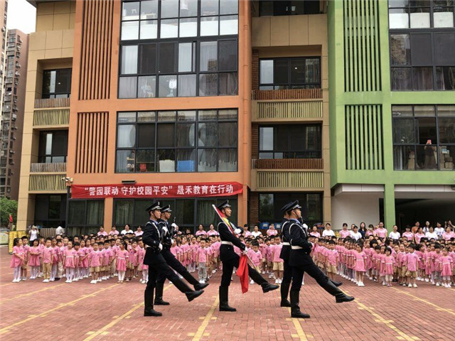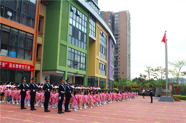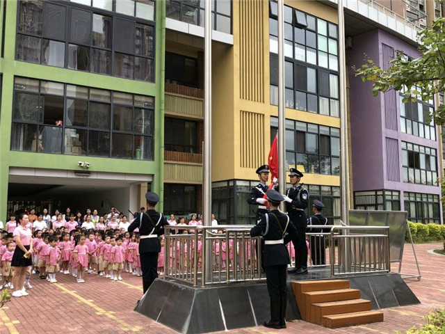 上午8:30,沐浴着初秋的晨阳,晟禾联建幼儿园全体师生整齐地站在操场上,等待着庄严的升旗仪式。仪式开始前,老师深入地向孩子们讲解了五星国旗的含义及升国旗的礼仪。随后,福建警察学院国旗护卫队的大哥哥们迈着整齐划一的步伐,将国旗护送至升旗台。
