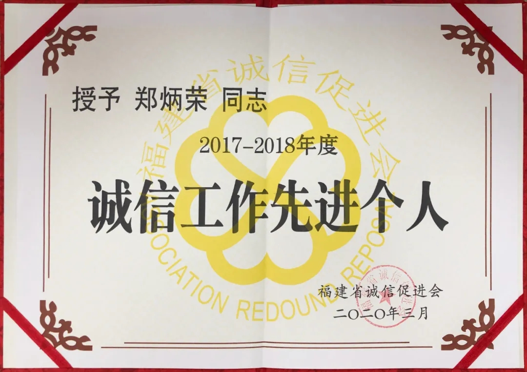 我司坚持诚信守法,自觉遵守国家法律法规,依法开展业务、照章纳税、保障职工合法权益;坚持以人为本,诚信服务;富有社会责任感,热心于社会公益事业;积极参与诚信事业建设,传播诚信正能量。先后荣获“诚实守信示范单位”、“福建省诚信教育基地”、“诚实守信示范单位”、“2019品牌中国诚信人物”等诚信称号。
