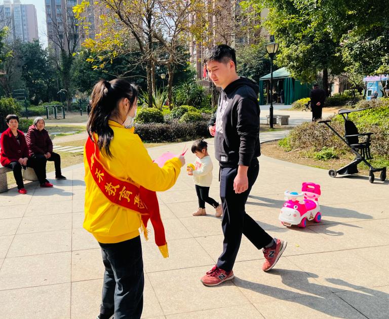 一早,党员志愿者们在联建社区内向社区居民发放0~3岁育儿知识宣传单,宣传早期教育的重要性,丰富家长们的早教知识。