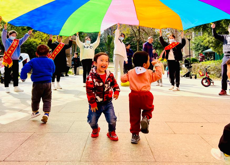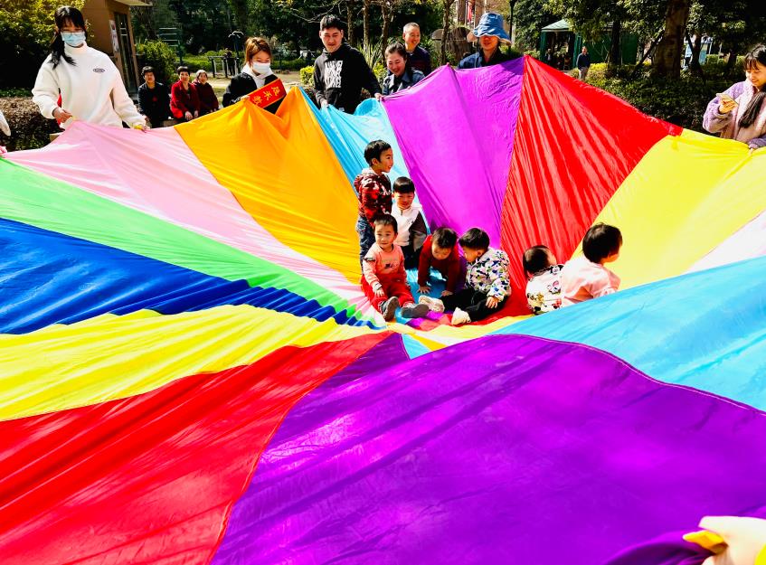 随后,党员志愿者们还组织社区的宝贝们一起进行“彩虹伞”游戏互动。宝贝们刚开始既好奇又怯怯,最终在老师门的热情感染下,兴高采烈地加入到游戏活动中。这些活动吸引着宝贝们和家长的积极参与,增进了家长对早教的认识和与宝宝之间的互动。